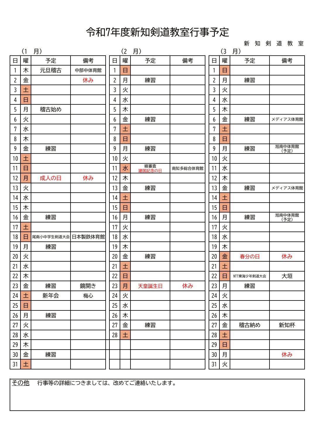 1~3月の予定をお知らせします